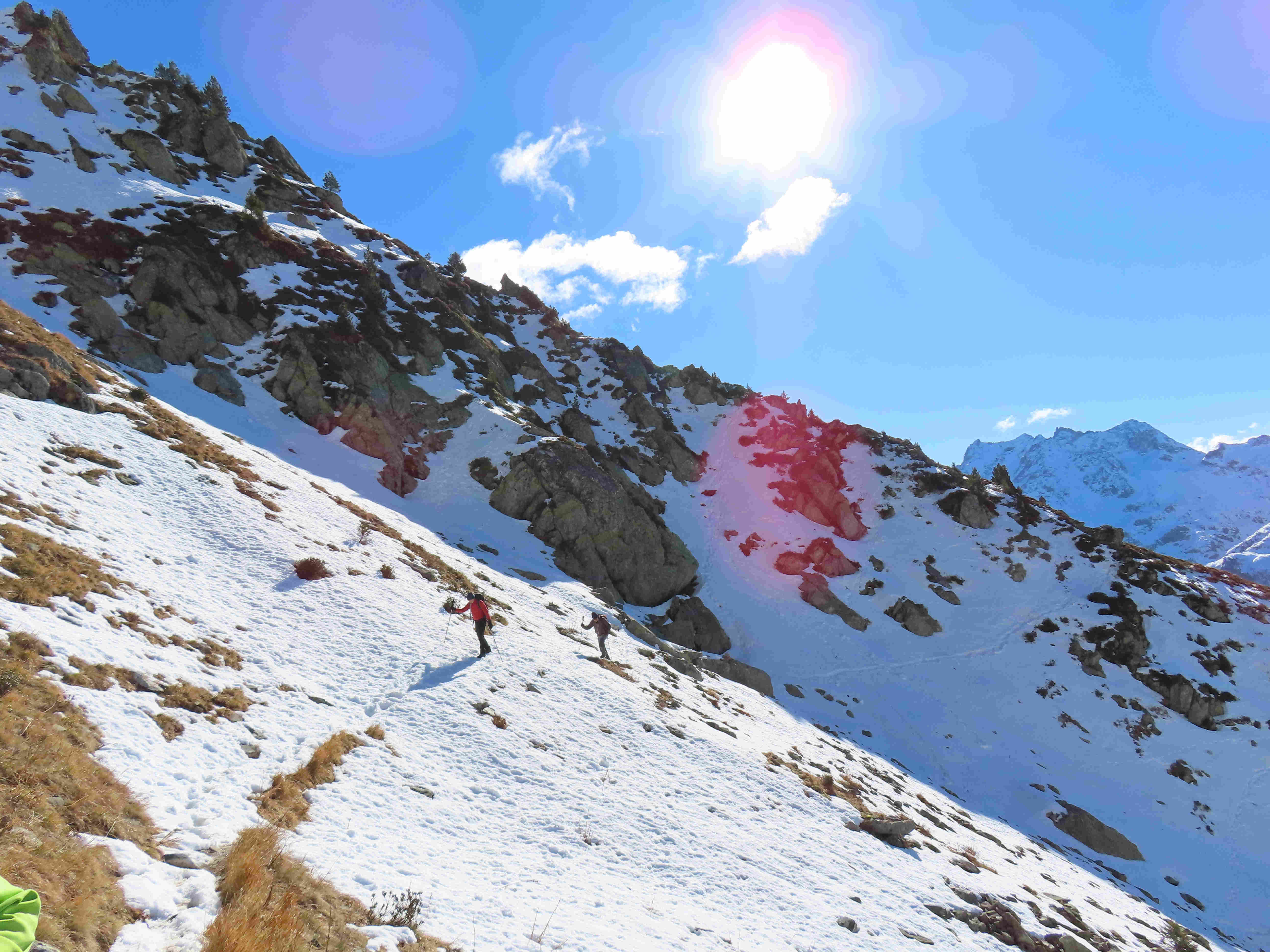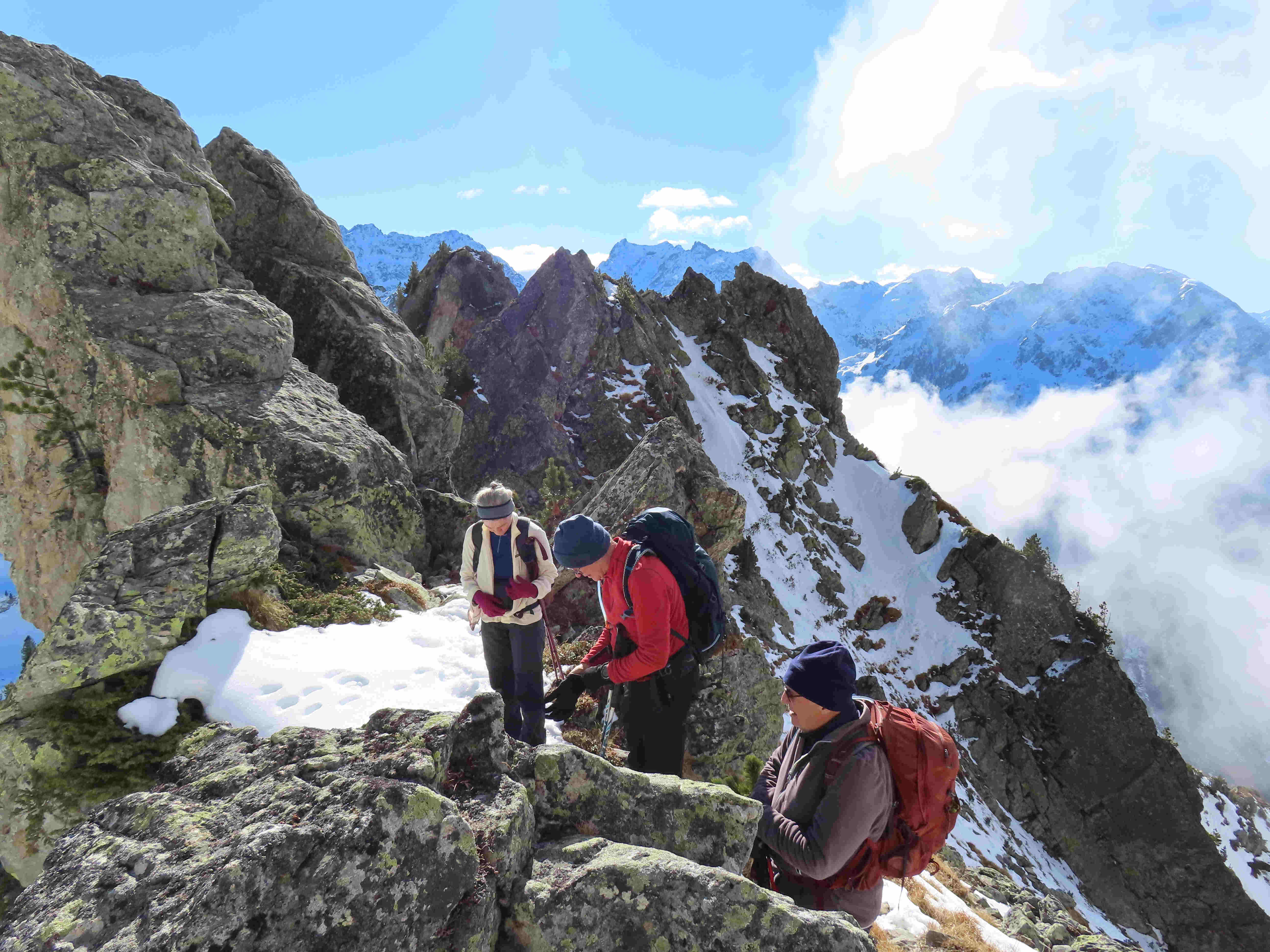 La descente, cette fois-ci par l'arête sud-ouest pour tout le monde, s’effectue sans problème. Certains mettent des crampons forestiers, qui conviennent parfaitement à ce type de terrain.