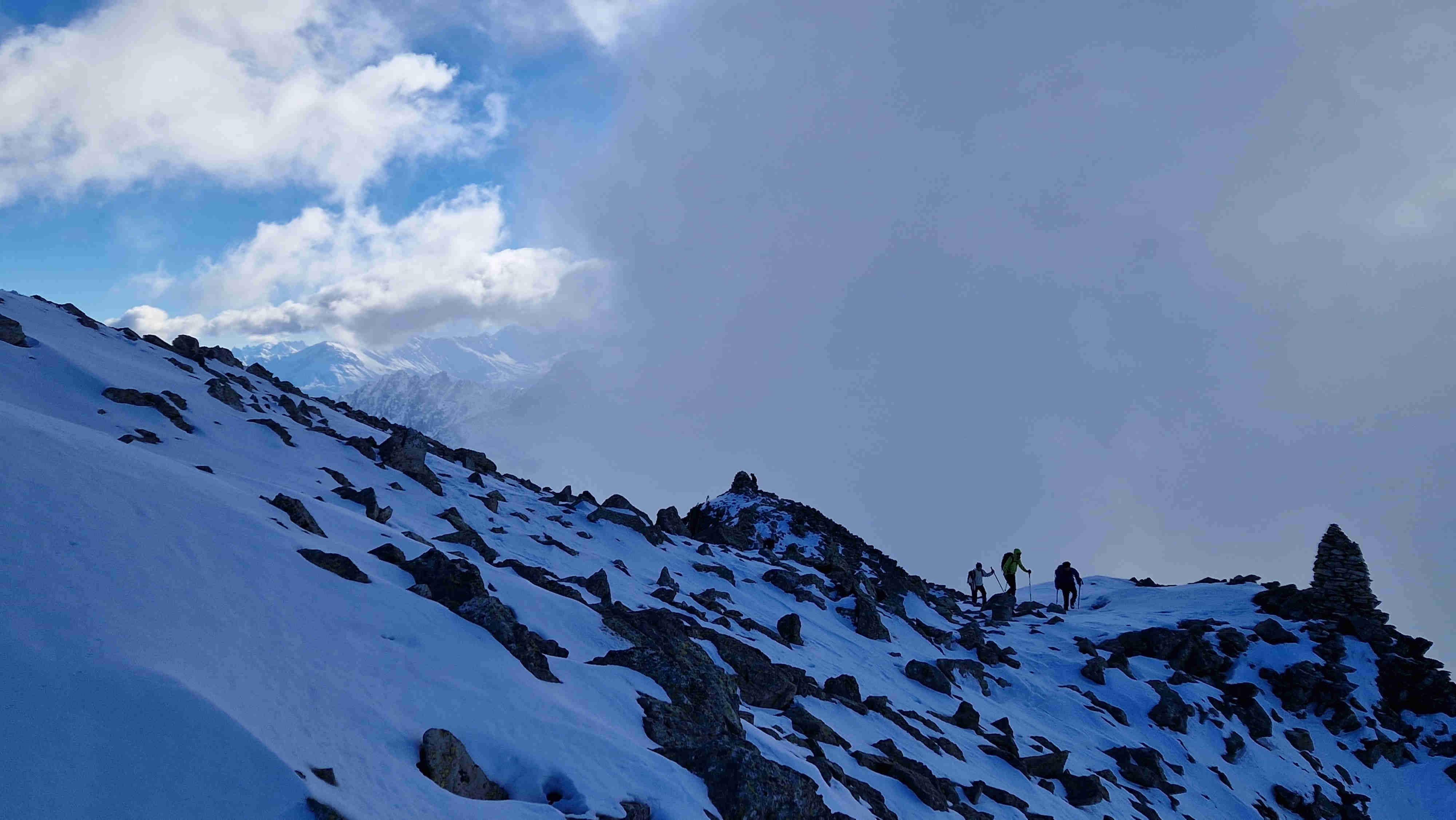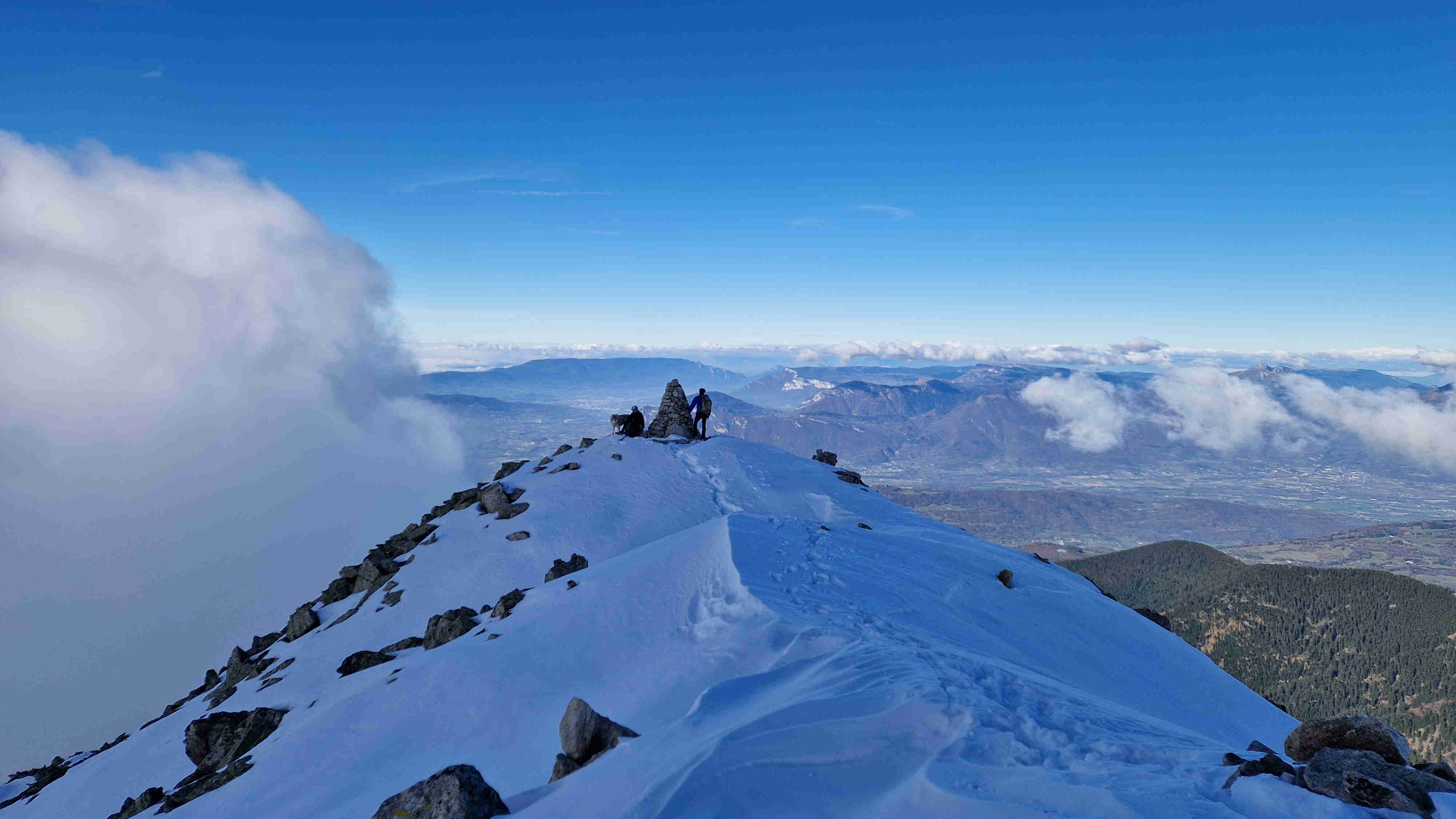 Le sommet nous offre une vue à 360° sur les Alpes du Nord, Belledonne, les Aiguilles d'Arves… le tout dans une ambiance hivernale. Nous croisons quelques randonneurs, dont certains s'inquiètent pour la descente.