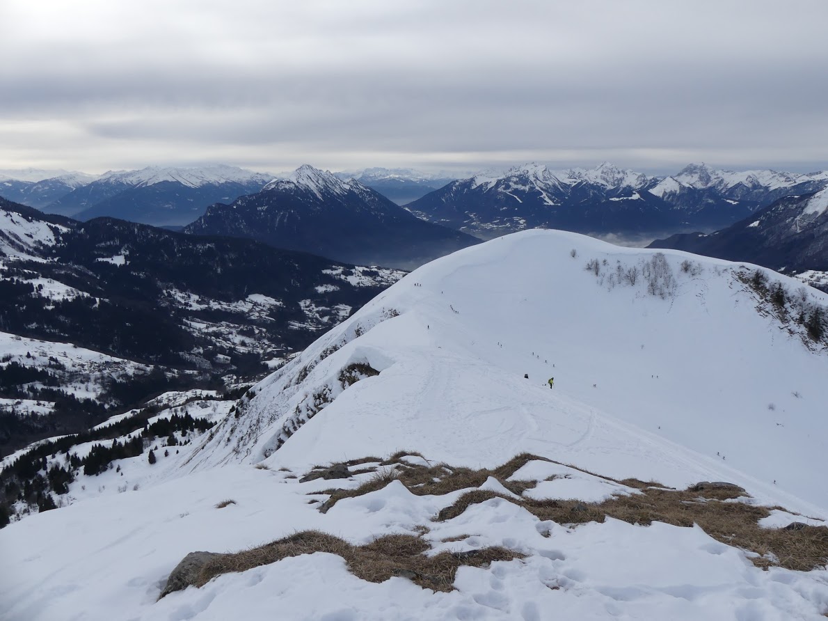 Il est 12 :10 lorsque Nadine tend son appareil photo à une des nombreuses personnes lorsque nous sommes TOUS au sommet à 1839 mètre d’altitude. La vue panoramique est remarquable, la neige redessinant les contours des sommets et les nuages teintant des couleurs d’hiver le ciel en 3D. La Montagne de Sulens a l’apparence d’un grand dos de cétacé. Sa crête s’étend peut-être sur un kilomètre, jalonnée ce jour-là de près de cent personnes sur tout son long. Nous sommes arrivés à notre but, c’est le moment attendu et traditionnel de faire la pause de midi, là, au sommet, au point culminant de la randonnée.