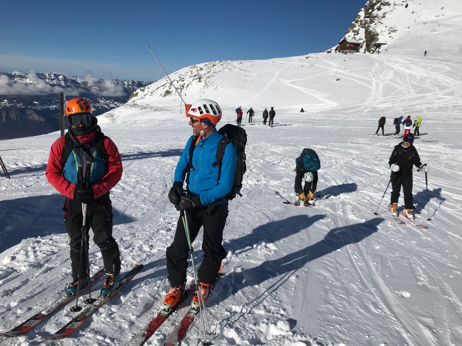 Le niveau du groupe et la volonté générale permet d'adapter la descente et de quiter les pistes bondées pour profiter des vallons avec une belle poudre quasi vierge. Nous optons même pour une remonté bonus vers le col de bedina afin de profiter au maximum des vallons sauvages et des bonnes conditions de neige en descendant par l'itinéraire de monté.