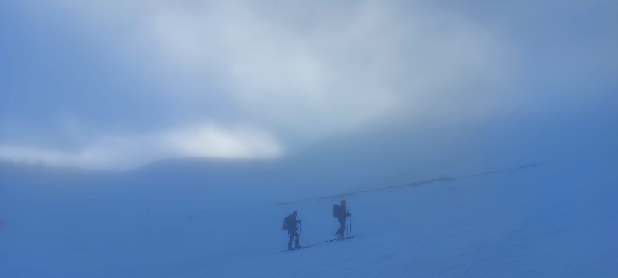 brouillard à l'arrivée du col de la Morte, les canons à neige marchent plein pot!