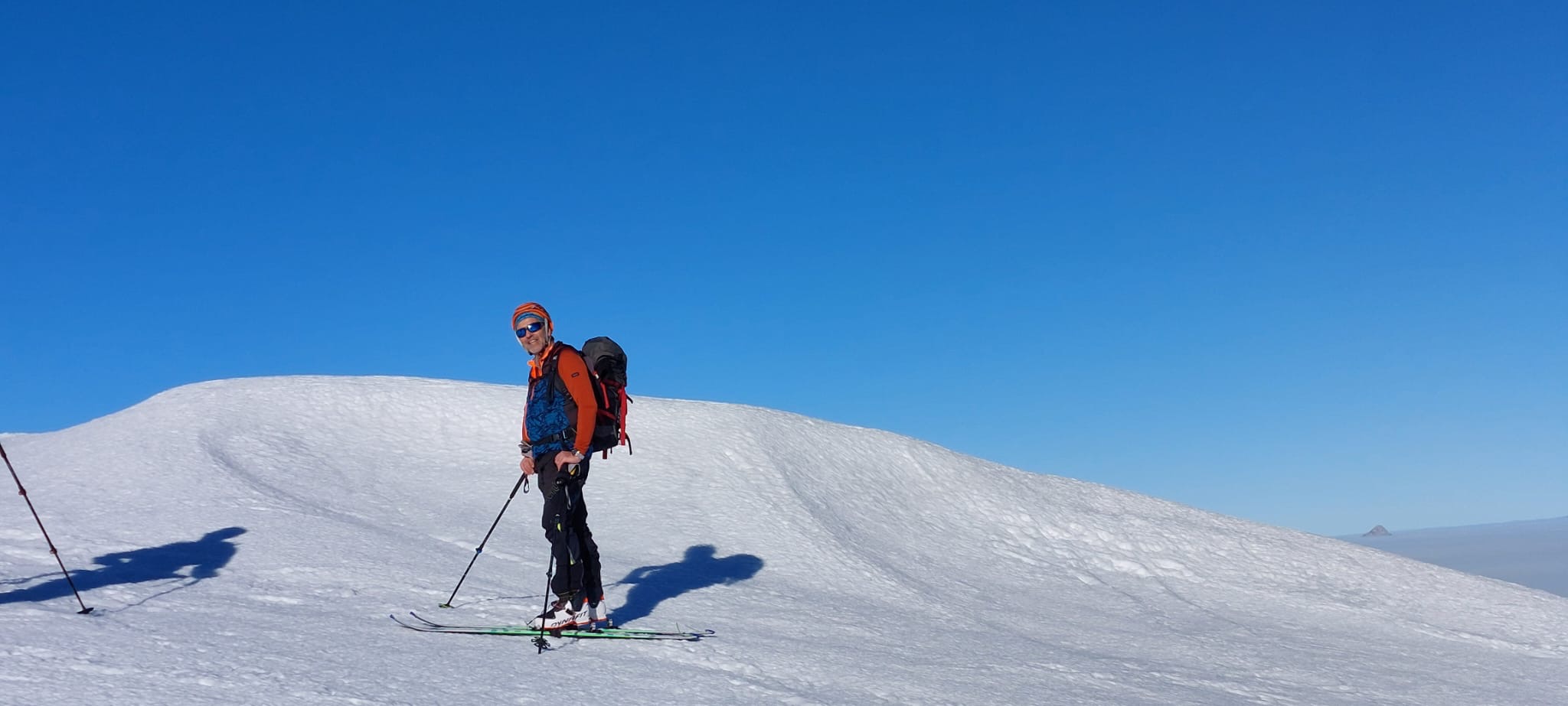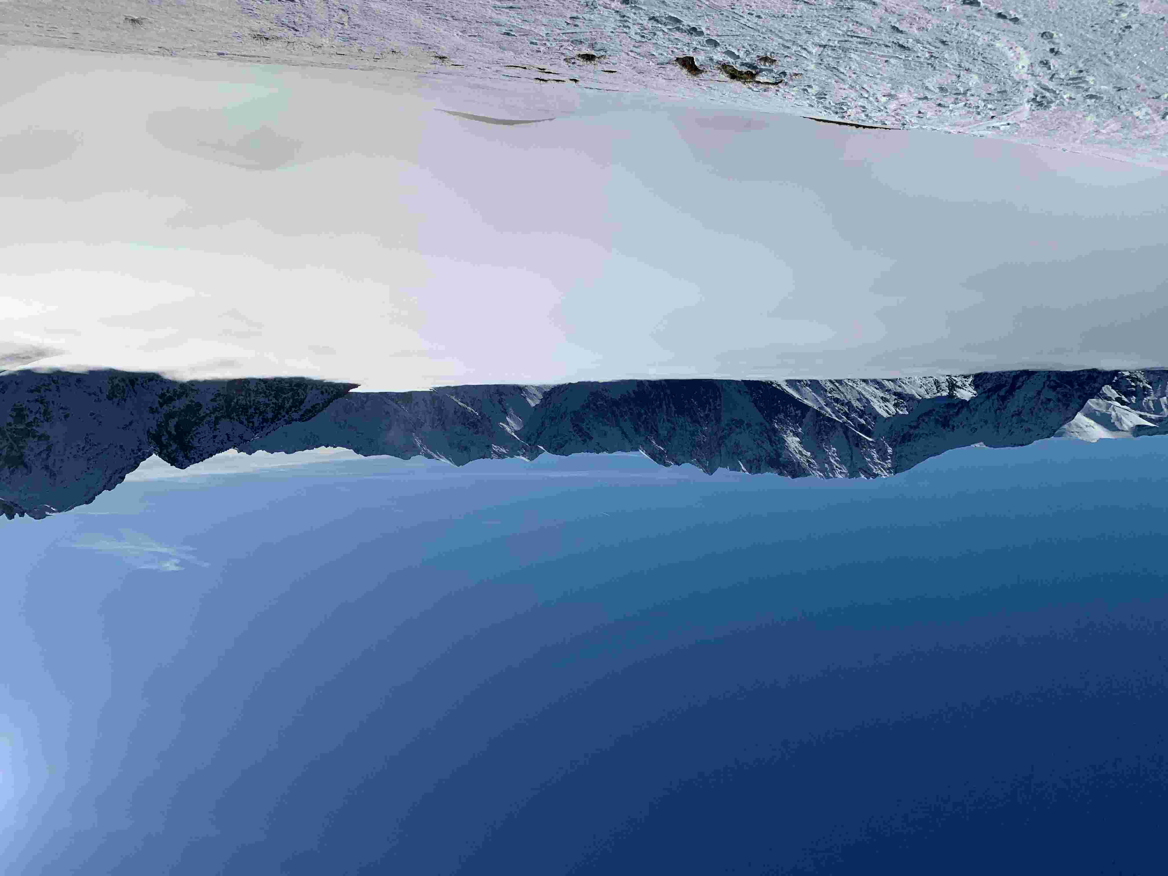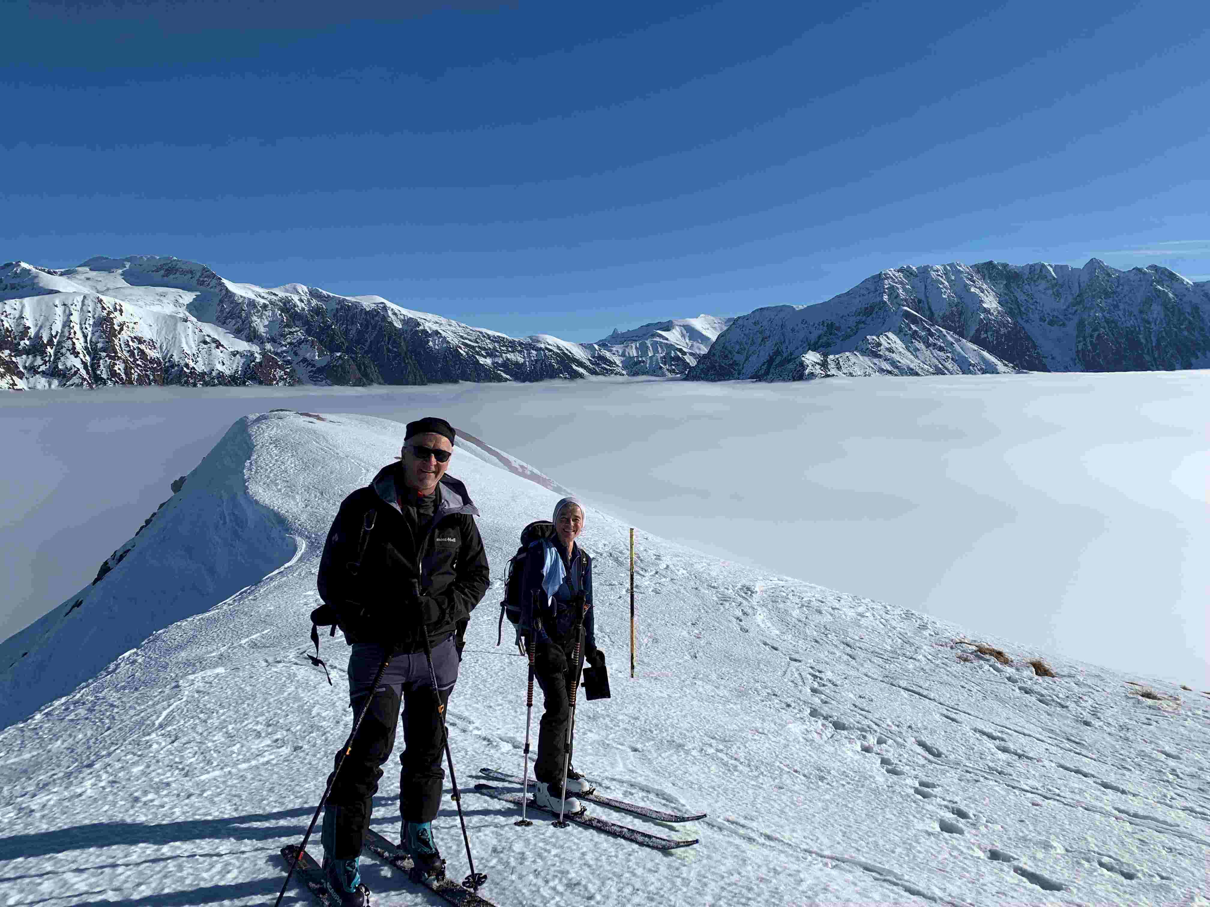 seule la piste de retour à la station est enneigée! nous montons sous la neige artificielle et le bruit des canons (sic!), impressionnant. après 300m+, nous prenons le chemin des motos-neige pour acceder finalement au dessus de la mer de nuages... une splendeur; nous faisons quelques antécimes pour nous poser à 2069m, soleil et beauté... 700m+ et retour dans le brouillard en descendant