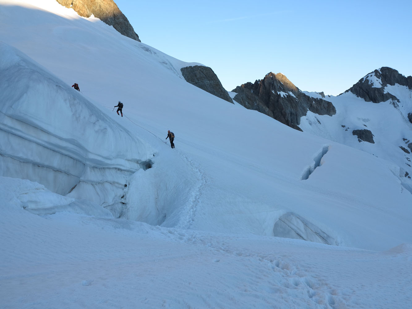 Difficulté : PD+ / III(IV) Glaciaire et rocher - Corde tendue – Rappels - Parcours long de haute montagne
