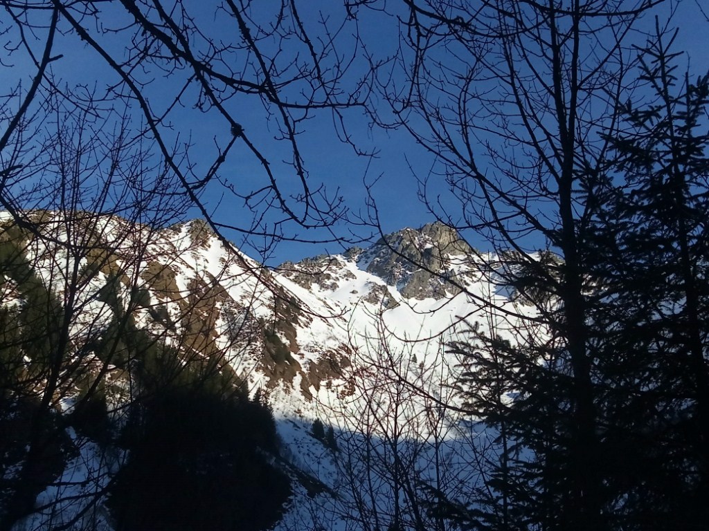 Bon c'est une station , les vacances, dimanche et il fait beau : le parking est blindé, ça grouille et un moniteur de ski nous indique gentiment de na pas prendre la route forestière qui sert de piste (ou l'inverse). Du coup, nous coupons à trvaers bois en pleine pente. Evidemment c'est plus long à enjamber les futaies. Nous nous retrouvons dans un ravin de ruisseau très pentu. Comme c'est une sortie-formation raquette terrain-alpin, la corde est sortie du sac... et bien utile. Les crampons sont chaussés dans du 40-45° bien inconfortable, c'est pédagogique ;) .Remis de ces émotions, nous allons sous le rocher de l'Evêque (direction du Pic de la Belle Etoile mais mnous en sommes loin et c'est pas l'objectif). après le casse-croute sorti du sac en début d'après-midi, nous effectuons queqlues exercices de pentes raides, de cramponnage, d'arrêts sur piolet. Nour revenons à la station qui se désertifie, il est plus de 17h.