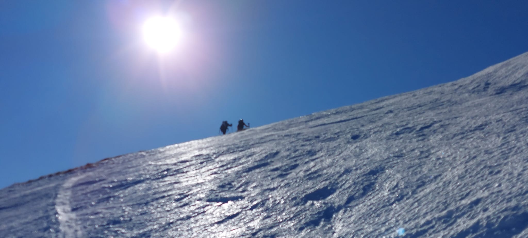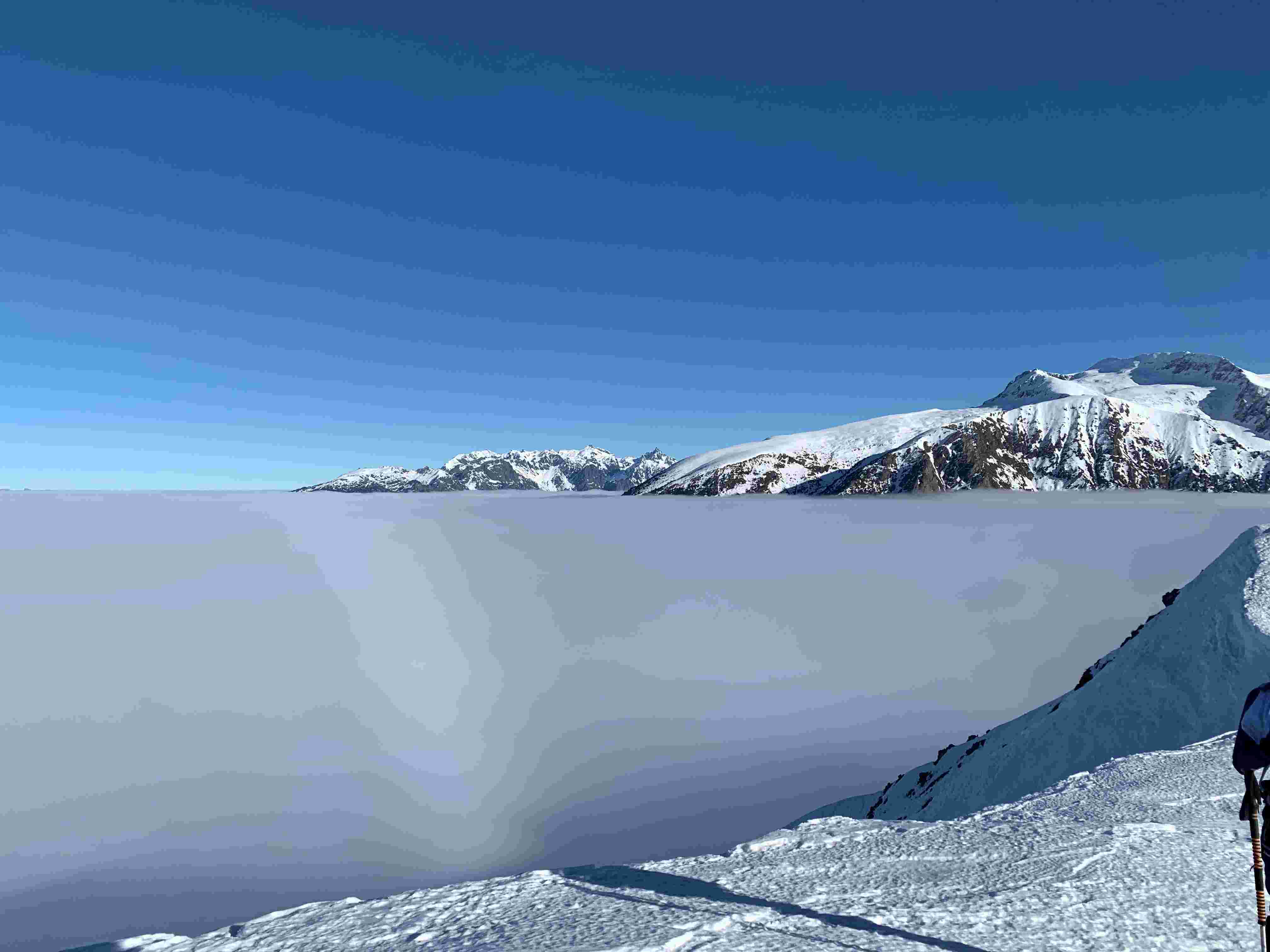 seule la piste de retour à la station est enneigée! nous montons sous la neige artificielle et le bruit des canons (sic!), impressionnant. après 300m+, nous prenons le chemin des motos-neige pour acceder finalement au dessus de la mer de nuages... une splendeur; nous faisons quelques antécimes pour nous poser à 2069m, soleil et beauté... 700m+ et retour dans le brouillard en descendant